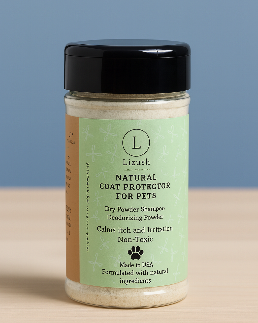 - Natural Coat Protector Powder: An all-natural powder made with arrowroot powder, baking soda, cornstarch, oat powder, marshmallow root powder, soap nut powder, and a drop of pet-safe lavender essential oil. This blend absorbs moisture, soothes the skin, and helps maintain a clean, fresh coat.